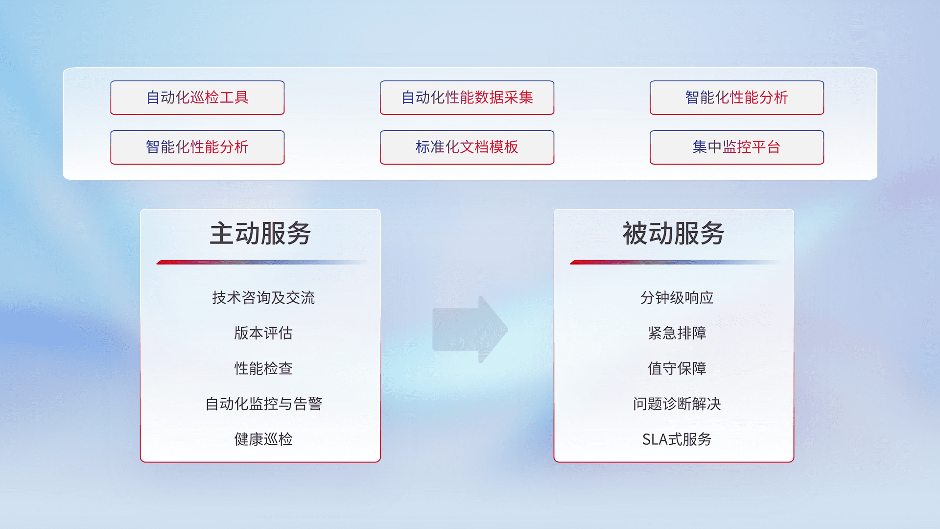 智能化工具和标准化文档,,,,保障服务质量,,,提供主动服务(包含技术咨询、、版本评估、、、性能检查、、自动化监控与告警、、、、健康巡检)和被动服务包含(分钟级响应、、、紧急排障、、值守保障、、问题诊断解决、、SLA服务)。。。