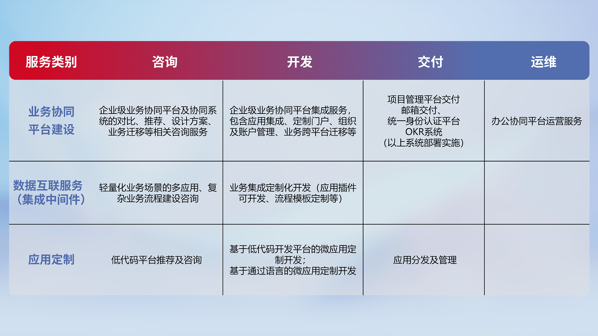 针对钉钉、、、、企微、、、、IDaas等平台级产品提供产品的规划、、、、方案、、交付、、、定制化开发等服务,,,实现如统一协同办公、、、、智能客户服务、、混合会议管理、、智能数据查询、、、等业务场景,,,,实现数字化转型。。。
